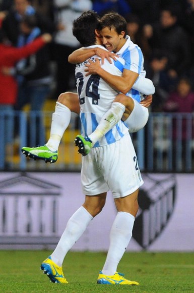 Malaga’s Paraguayan forward Roque Santa Cruz (L) celebrates with Malaga’s Argentinian midfielder Diego Buonanotte during the Spanish league football match Malaga CF vs Granada CF at La Rosaleda stadium in Malaga on December 8, 2012. AFP PHOTO/ JORGE GUERRERO (Photo credit should read Jorge Guerrero/AFP/Getty Images)